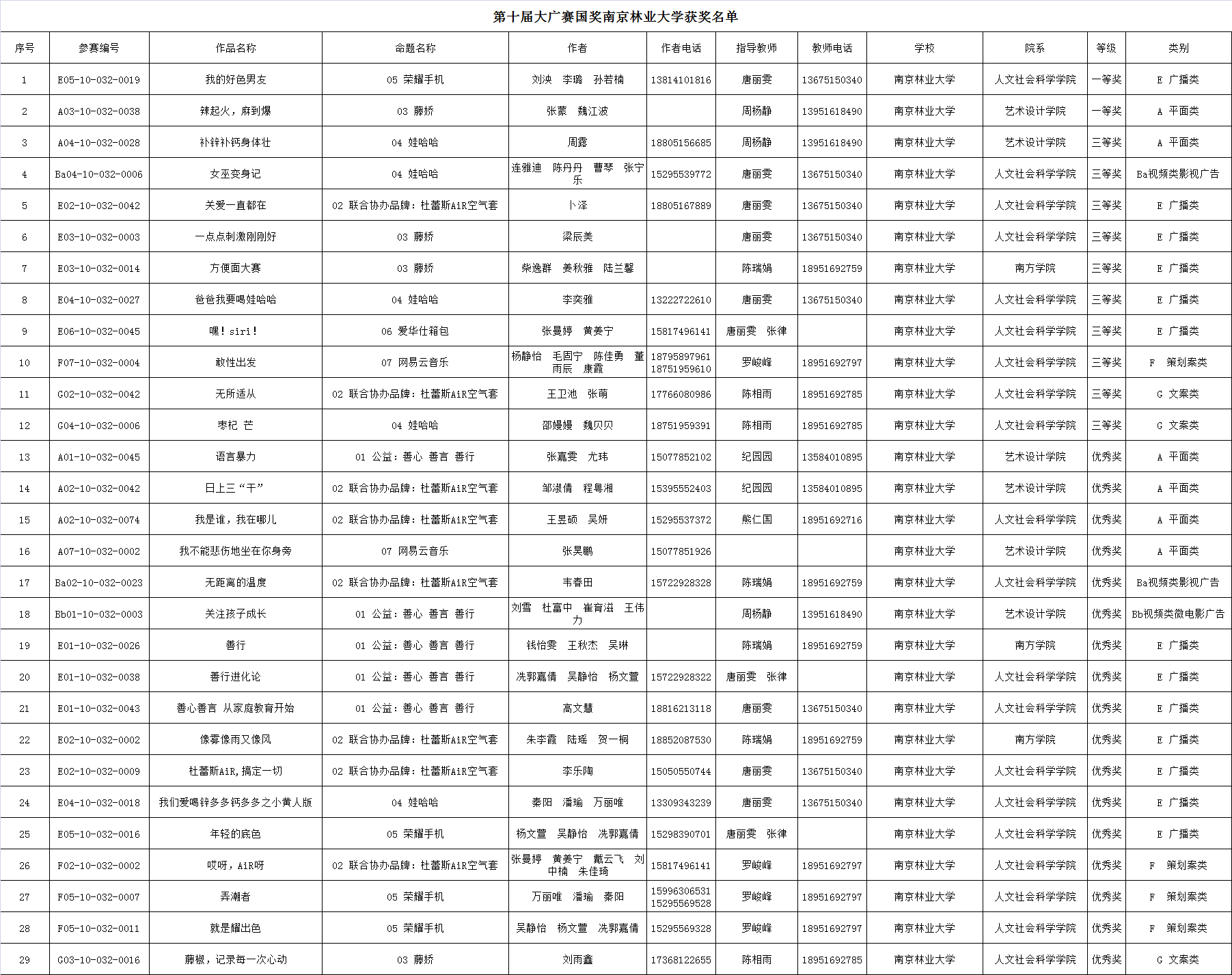 附:第十届全国大学生广告艺术大赛全国等级奖我校获奖名单